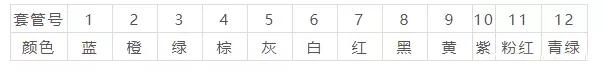 光纜線序色譜排列光纖色譜1# -12#:一般是藍、桔、綠、棕、灰、白、紅、黑、黃、紫、粉紅、青綠。