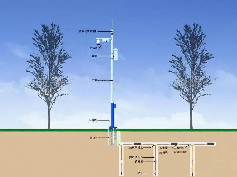 1、前端設備如攝像頭應置于接閃器(避雷針或其它接閃導體)有效保護范圍之內。當攝像機獨立架設時,避雷針最好距攝像機 3-4 米的距離。如有困難避雷針也可以架設在攝像機的支撐桿上,引下線可直接利用金屬桿本身或選用Φ8 的鍍鋅圓鋼。為防止電磁感應,沿桿引上攝像機的電源線和信號線應穿金屬管屏蔽。