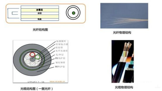重量輕,體積小、傳輸遠(yuǎn)(衰減小)、容量大、抗電磁干擾。光纜一般由多根光纖和塑料保護(hù)套管及塑料外皮構(gòu)成。通常看到工人敷設(shè)的黑色線纜叫做光纜,里面包含了多組光纖。下圖為光纖和光纜圖片: