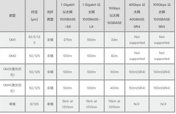 OM1、 OM2、 OM3分別多模光纖的3個(gè)等級(jí),不同等級(jí)傳輸時(shí)的帶寬和最大距離不同,如表: