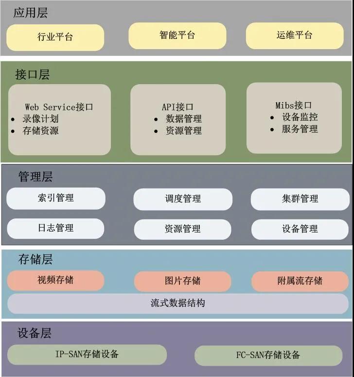 云存儲系統采用分層結構設計,整個系統從邏輯上分為五層,分別為設備層、存儲層、管理層、接口層、應用層。
