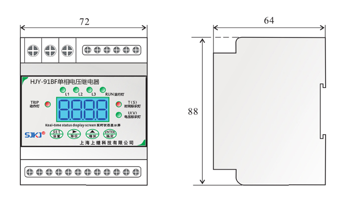 , 無數值顯示。繼電器達到所設定值,動作后,由TIRP動作燈會點亮,實際線路電壓低于或高于所設定的返回值,指示燈切換回來。正常運行情況下,RUN運行燈、電壓設置表示燈常亮。L1、L2、L3來回切換運行。當輸入電壓任意一相滿足動作條件,繼電器動作,電壓標識燈熄滅,表示延時時間已到動作。當輸入接近動作條件時,繼電器進入動作預備狀態,所有芯片資源用來計算輸入值,一旦滿足條件,立即啟動計時,繼電器設有啟動量連續判斷功能和突變量連續判斷功能,能夠有效迅速的判斷輸入值,并躲過短時干擾。HJY-91BF單相欠電壓繼電器接線圖