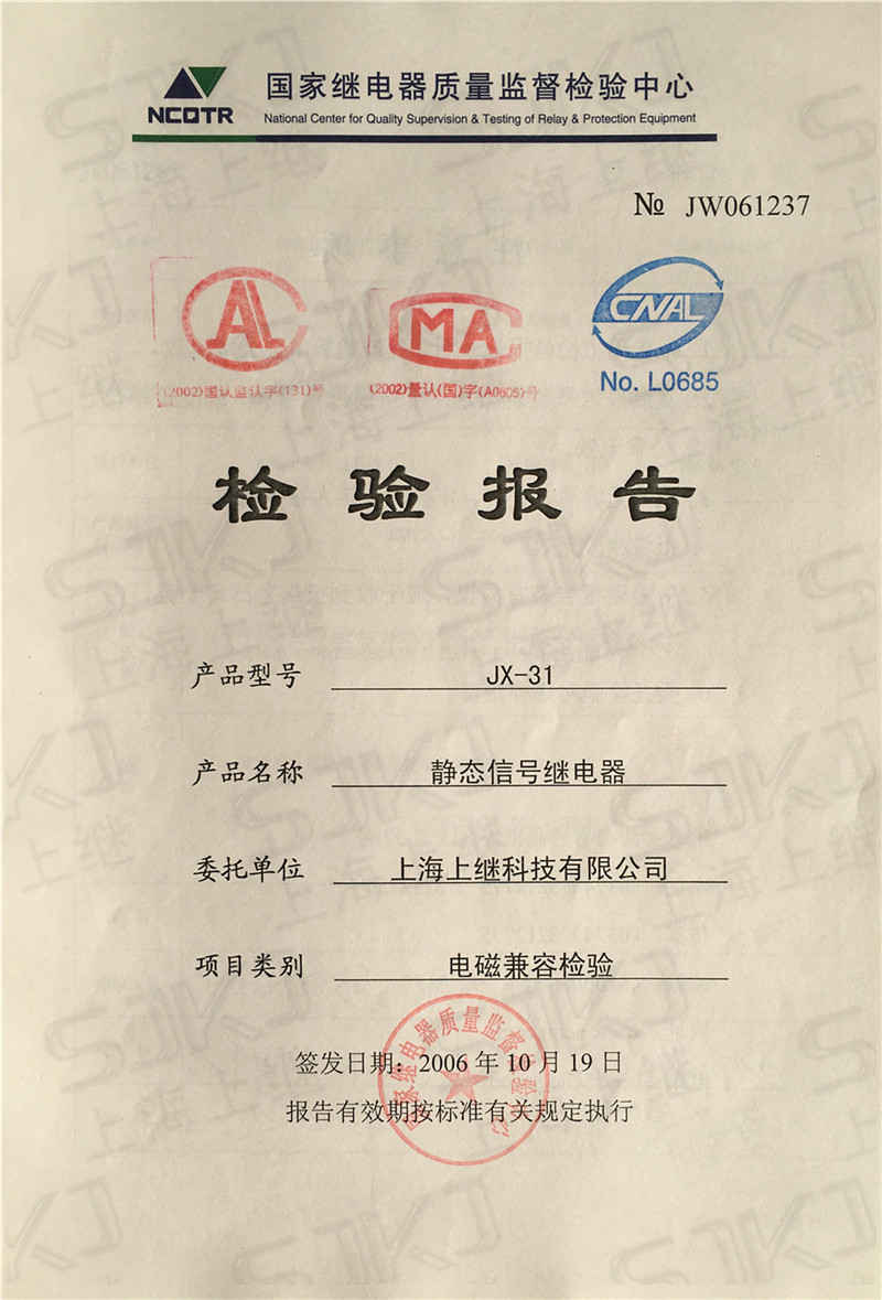 您現在的位置: 首頁 >> 客戶服務 >> 資質證書 > JX-31檢驗報告