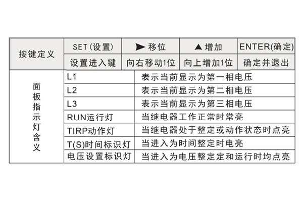 , 無數值顯示。繼電器達到所設定值,動作后,由TIRP動作燈會點亮,實際線路電壓低于或高于所設定的返回值,指示燈切換回來。正常運行情況下,RUN運行燈、電壓設置表示燈常亮。L1、L2、L3來回切換運行。當輸入電壓任意一相滿足動作條件,繼電器動作,電壓標識燈熄滅,表示延時時間已到動作。當輸入接近動作條件時,繼電器進入動作預備狀態,所有芯片資源用來計算輸入值,一旦滿足條件,立即啟動計時,繼電器設有啟動量連續判斷功能和突變量連續判斷功能,能夠有效迅速的判斷輸入值,并躲過短時干擾。