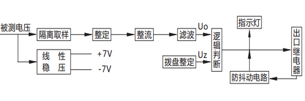 被測電壓經過隔離取樣后,得到與被測電壓成比例的取樣電壓Ui、Ui經撥盤整定,再進行整流濾波,得到直流Uo,邏輯回路將Uo 與門坎電壓Uz進行比較。若Uo<Uz,則出口繼電器不動作;若Uo>Uz,則出口繼電器動作。欠電壓在欠電壓狀態(tài)下動作指示燈發(fā)光 過電壓在過電壓狀態(tài)下動作指示燈發(fā)光。