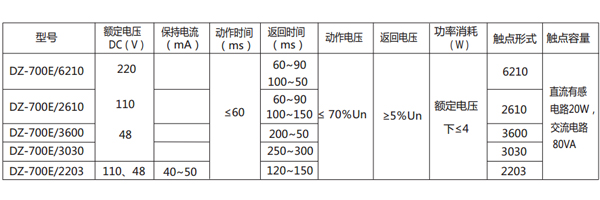 DZ-700E型中間繼電器主要技術(shù)數(shù)據(jù)見表